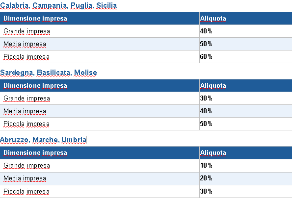 - Aliquote maggiori (art. 107, par. 3, lett. a TFUE): Basilicata, Calabria, Campania, Molise, Puglia, Sardegna, Sicilia.